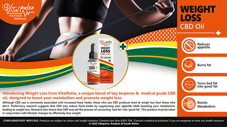 Introducing Weight Loss from VitalPulse, a unique blend of key terpenes & medical grade CBD oil, designed to boost your metabolism and promote weight loss.