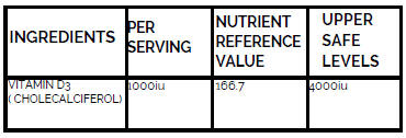 Vitamin D3 supports the development and maintenance of bones, teeth, skin, hair, nails and a healthy immune, brain and nervous system.